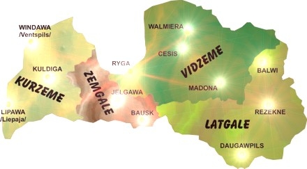 - Latgale – Wschodnia część Łotwy i byłych Inflant. Kraina jezior i lasów. Na Łotwie Łatgalia nazywana są kraino niebieskich jezior. Między miejscowościami Krasławą, Agłoną i Ezernieki koncentruje się największa liczba jezior na Łotwie. Więcej informacji na temat "co zwiedzić w Łatgalii"